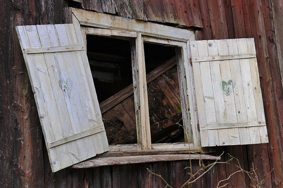 här på sin ledighet. Det ser nästan ut som det en gång varit ett gammalt torp som försetts med fönsterluckor med hjärtan på.